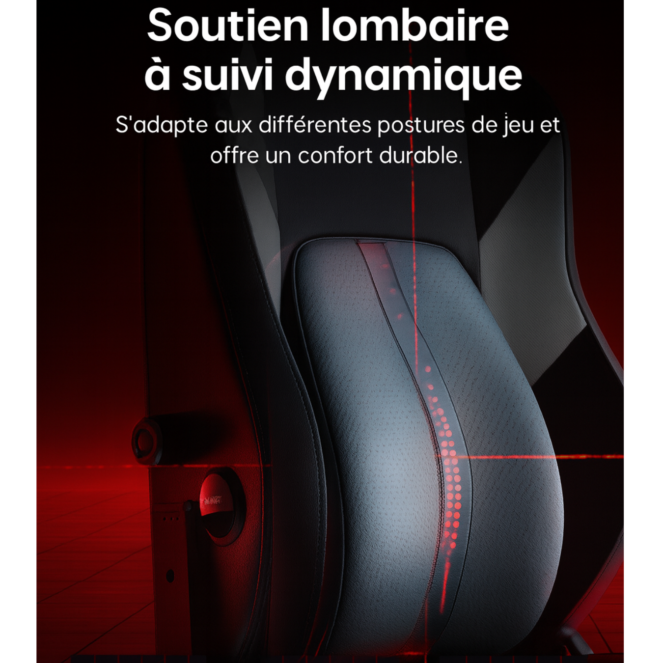 Chaise de gaming ergonomique avec soutien lombaire dynamique pour un maintien adapté à toutes les morphologies. Son coussin d’assise à ressorts et mousse haute densité, ses accoudoirs 6D pliables et son dossier inclinable jusqu’à 160° offrent confort et polyvalence pour de longues sessions.