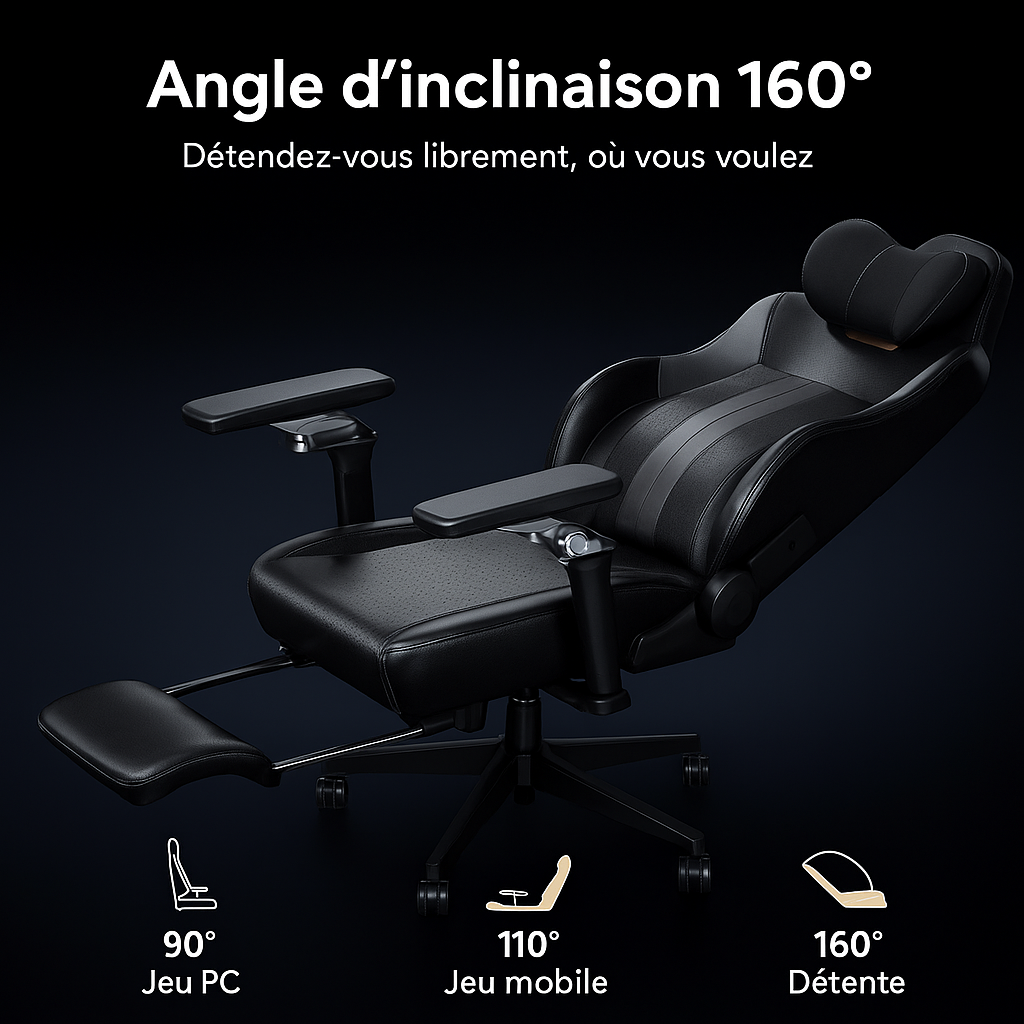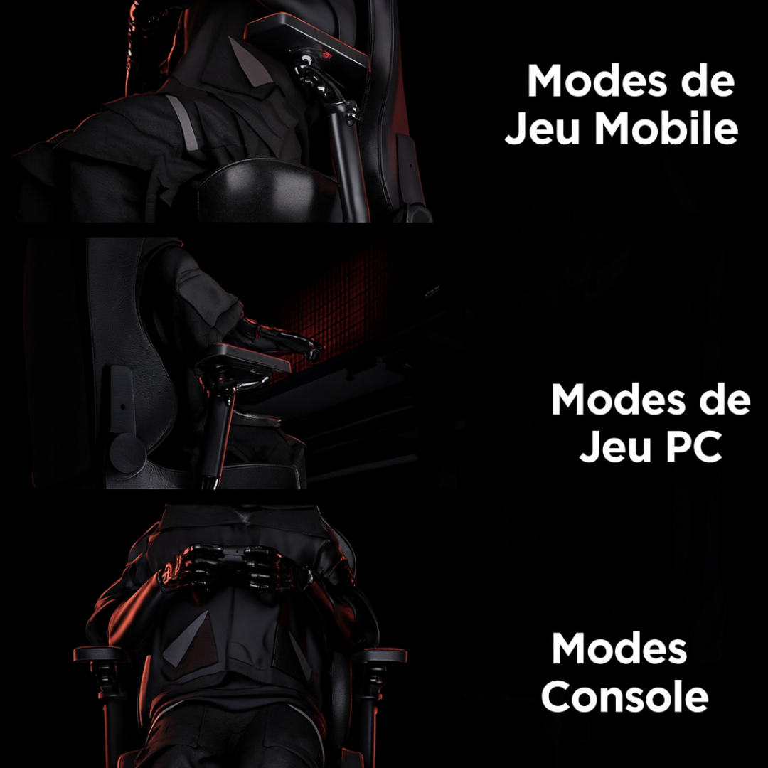 - Accoudoirs mécaniques 6D : réglages multiples et pliables pour s’adapter à tous les usages (PC, mobile, console)