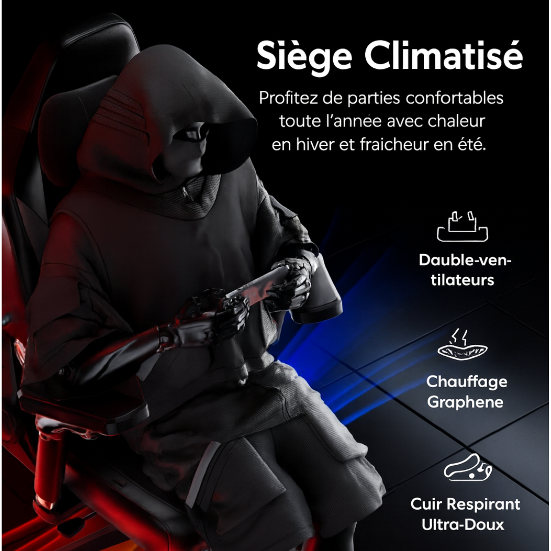 Chaise de gaming ergonomique équipée d’un système de ventilation et chauffage intégré pour un confort adapté en toute saison. Son soutien lombaire dynamique, ses accoudoirs 6D pliables et son dossier inclinable jusqu’à 160° en font une assise idéale pour jouer ou travailler pendant de longues heures.