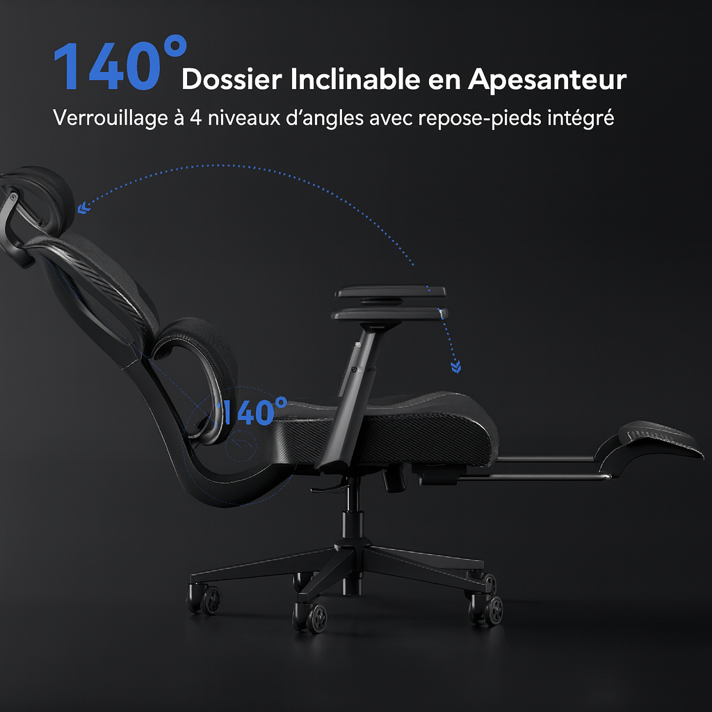 Oui. Selon le modèle, nos accoudoirs sont réglables en 2D, 3D ou 4D (hauteur, profondeur, rotation, largeur). Le dossier peut s’incliner jusqu’à 165°, et la fonction bascule permet un confort supplémentaire.