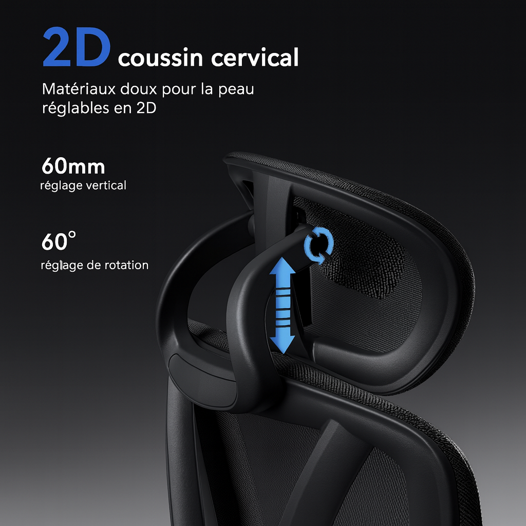 - Appui-tête 2D : réglable en hauteur (60 mm) et en rotation (60°)